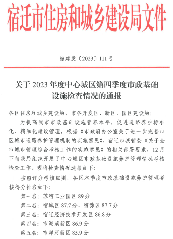 近日,宿遷市住房和城鄉(xiāng)建設(shè)局通報2023年中心城區(qū)第四季度市政基礎(chǔ)設(shè)施考核檢查情況,園區(qū)以89分的成績喜獲全市第一名。