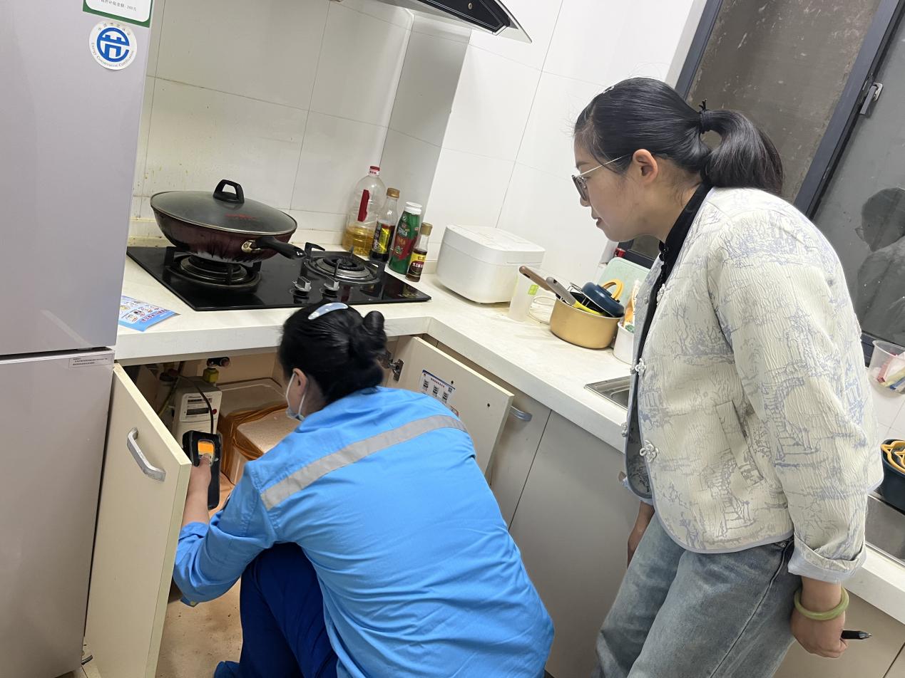 工作人員對(duì)燃?xì)庥脩糸_(kāi)展逐戶檢查,重點(diǎn)對(duì)天然氣接口軟管是否老化、燃?xì)馄骶呤欠癯谑褂?、是否有熄火保護(hù)措施,燃?xì)忾y門是否正常使用等問(wèn)題進(jìn)行全面檢查。在檢查過(guò)程中,發(fā)現(xiàn)廚房操作間積堆物品、線路交叉重疊等現(xiàn)象,要求客戶立即整改。