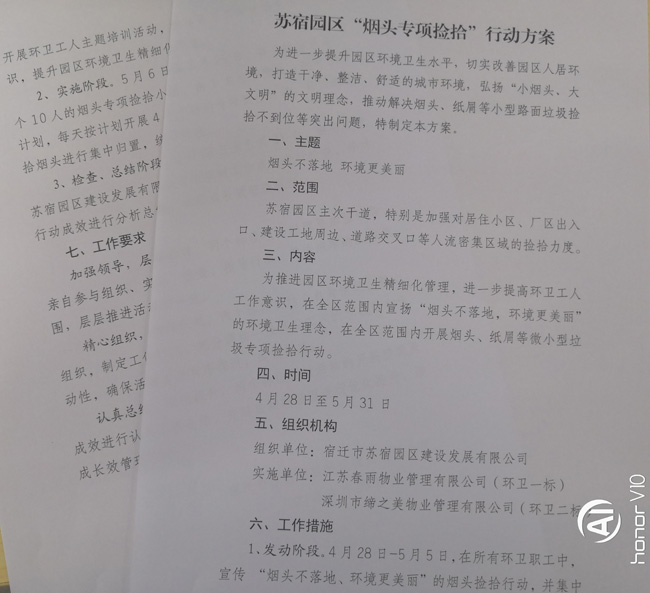 為了確?!盁燁^專項撿拾”行動順利開展,公司結合園區(qū)實際,精心籌劃,制定了《蘇宿園區(qū)“煙頭專項撿拾”行動方案》。