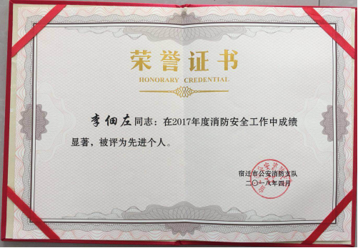 5月2日下午,宿遷市公安消防支隊召開了“全市一級消防安全重點單位“工作會議,建發(fā)公司物業(yè)部安防主管李佃左同志在2017年消防安全工作中成績顯著,被評為先進個人。