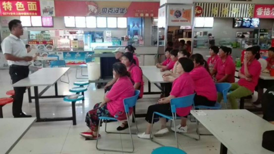 此次培訓(xùn)活動(dòng)主要為保潔員普及夏季防暑降溫常規(guī)知識(shí),以及中暑的現(xiàn)場(chǎng)急救措施。告誡保潔人員工作期間多飲水,并隨身攜帶公司發(fā)放的清涼油、藿香正氣水等夏季防暑物品,工作中一旦出現(xiàn)頭暈、惡心、口干、迷糊、胸悶氣短等癥狀時(shí),應(yīng)立即停止作業(yè)并上報(bào)管理人員。