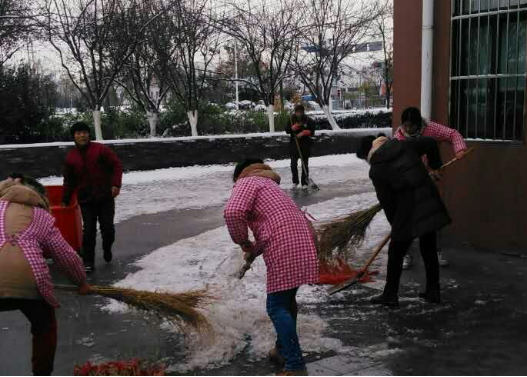 次日氣溫驟降,零下4度,多數(shù)路面存在結(jié)冰現(xiàn)象,加上路面落葉較多。天未亮,保潔、安保人員就到達(dá)園區(qū)公舍主干道、單元門、地庫出入口等指定區(qū)域,伴隨著凜冽的寒風(fēng),開始除雪化冰。對于他們來講,這注定又是忙碌的一天,經(jīng)過2個(gè)小時(shí)緊張而有序的忙碌,基本完成了各個(gè)園區(qū)公舍各個(gè)路面、單元門、非機(jī)動(dòng)車道、地庫出入口積雪的清掃工作。